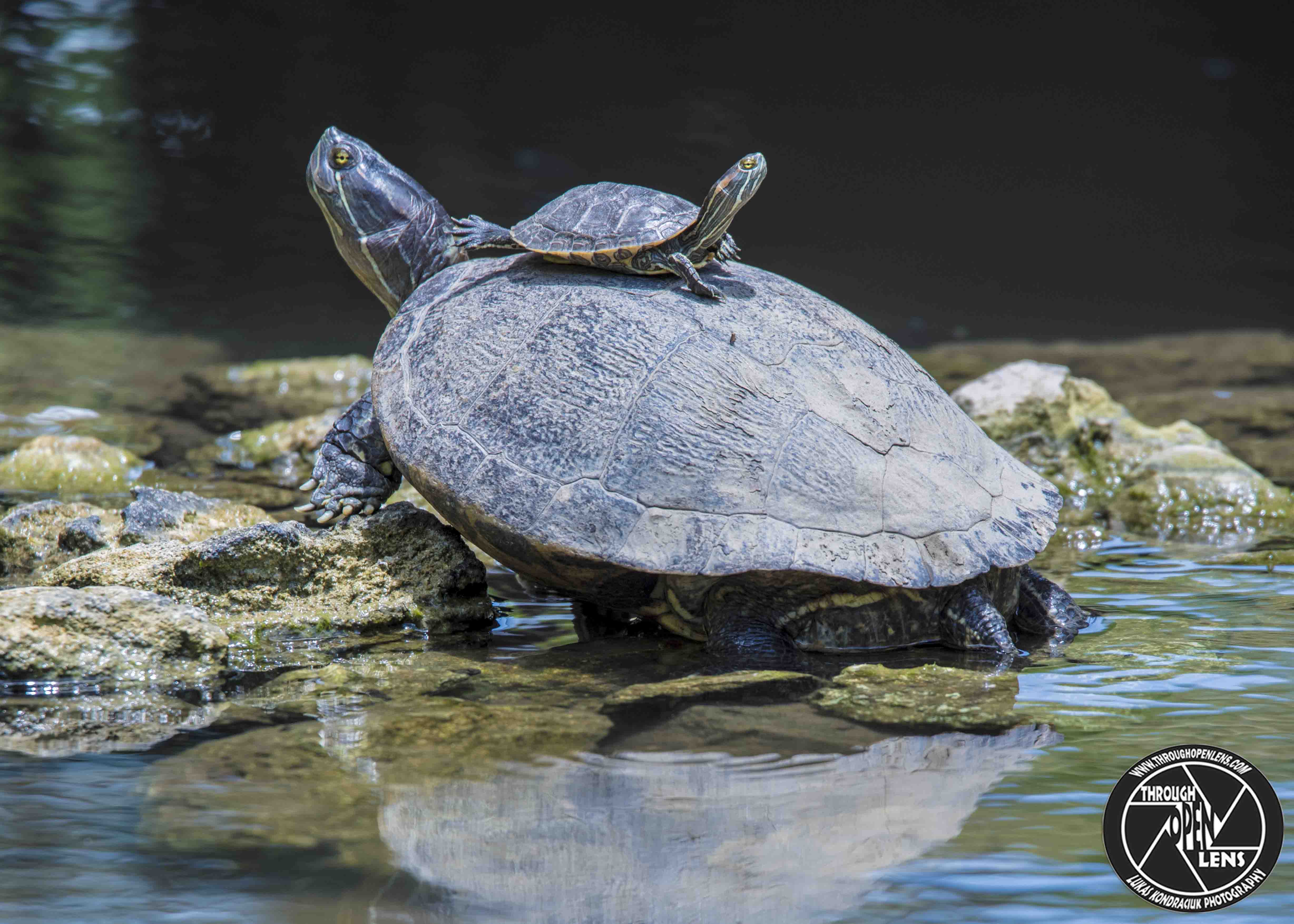 Interesting Fact: Unlike red-eared sliders, they do not have red patches on their heads. They have distinct light and dark stripes on their necks, feet, and tails. The tops of their shells are brown and the bottoms are yellow. ( https://en.wikipedia.org/wiki/Hispaniolan_slider )